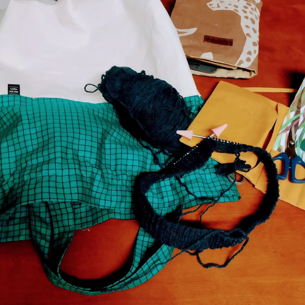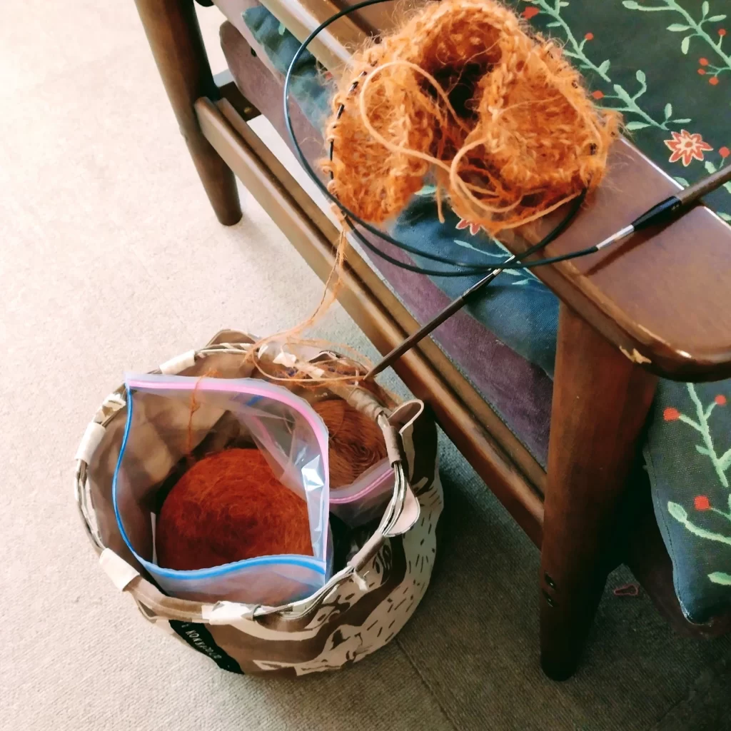 なんでもかんでも入れておきたいのか、今編んでいる針のついた毛糸玉だけ入ればいいのか。