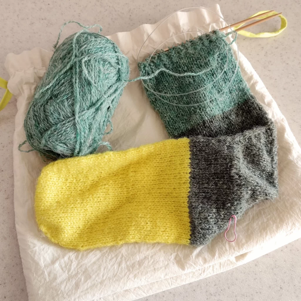 「働くセーター」を編みかけのまま、外編み用に靴下をスタート。病院の待ち時間に、ジェイミソンズの毛糸で編み始めた記録です。