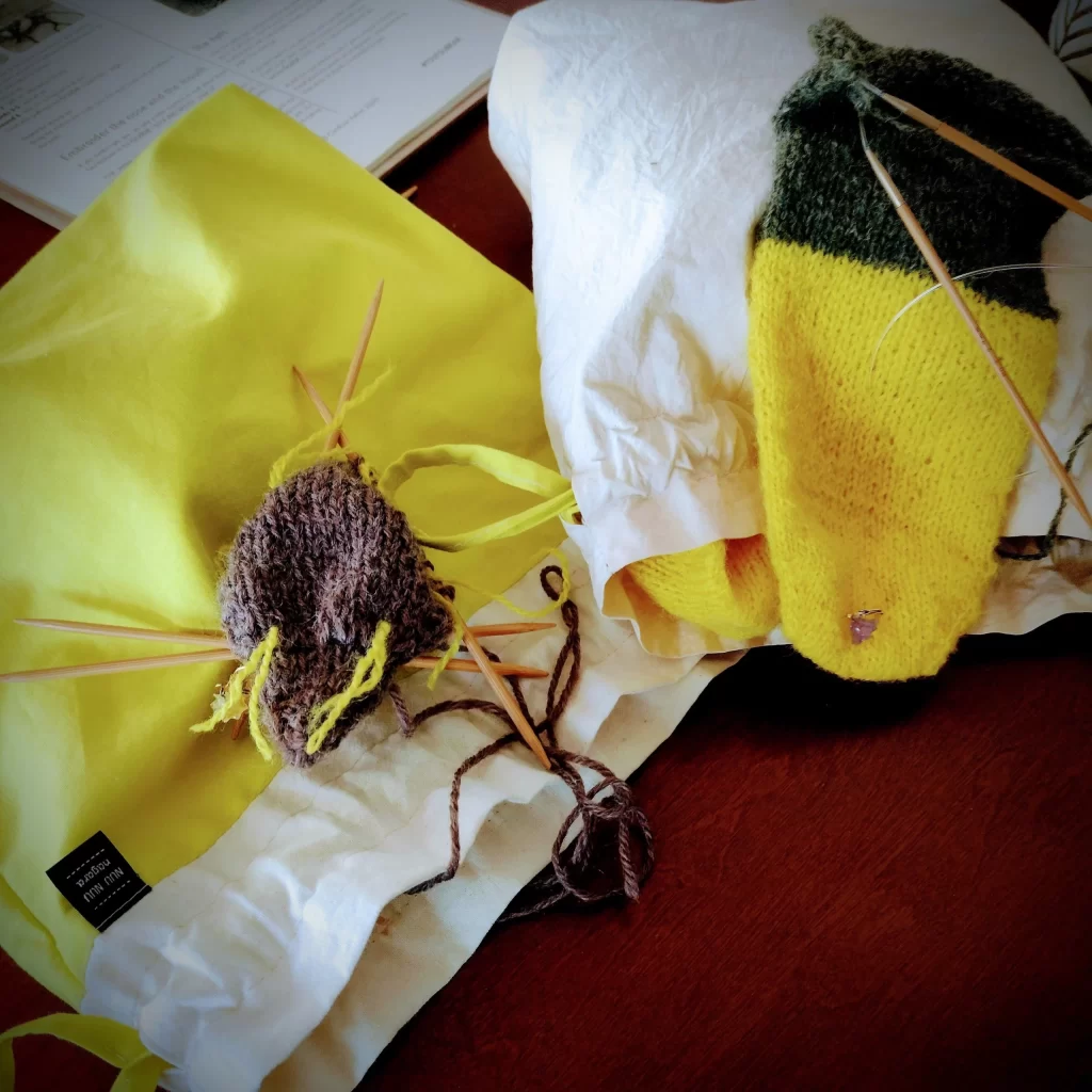 同じ袋です。右はひっくり返したもの。靴下編みが入ってます。