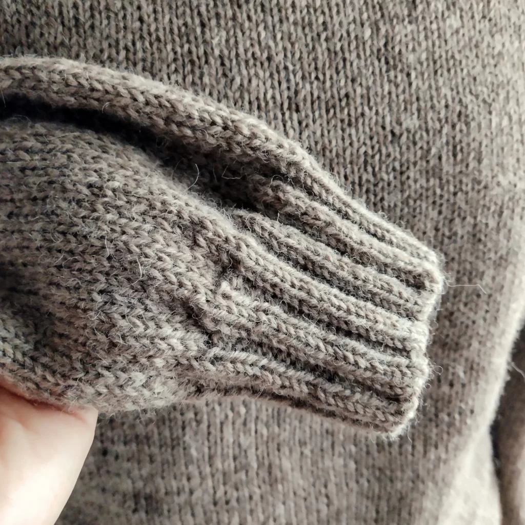 今回は1枚目を編んだ時に余った糸で編めそうだと踏んだのですが、やっぱり微妙に足りなくて、袖のゴム編みが半分の長さになってます。